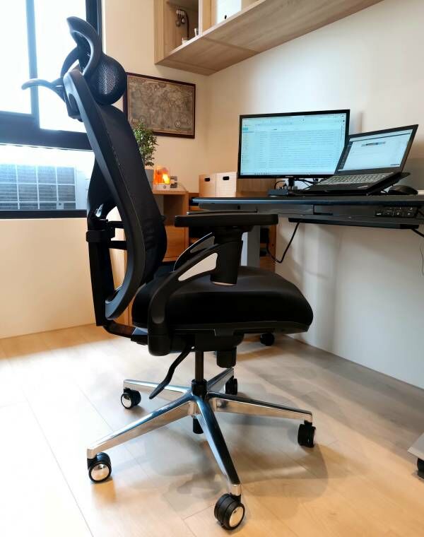 選擇這張一方面是預算考量,一方面也是它的椅腳寬度不會太大,畢竟小宅會多考量空間問題,然後工學椅的座位部分,往往有網布與泡綿兩種形式,網布的透氣性較佳,不過幫主考量自己一旦開工就坐超級久,選擇厚泡綿的款式比較舒適些。