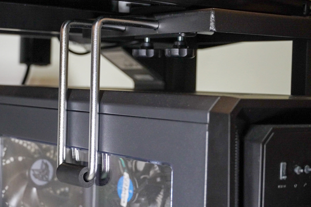 鋼鐵結構最大可承重 15kg,懸吊式可防潮,延長主機壽命,滑軌設計可以360度旋轉,讓桌面空間更清爽