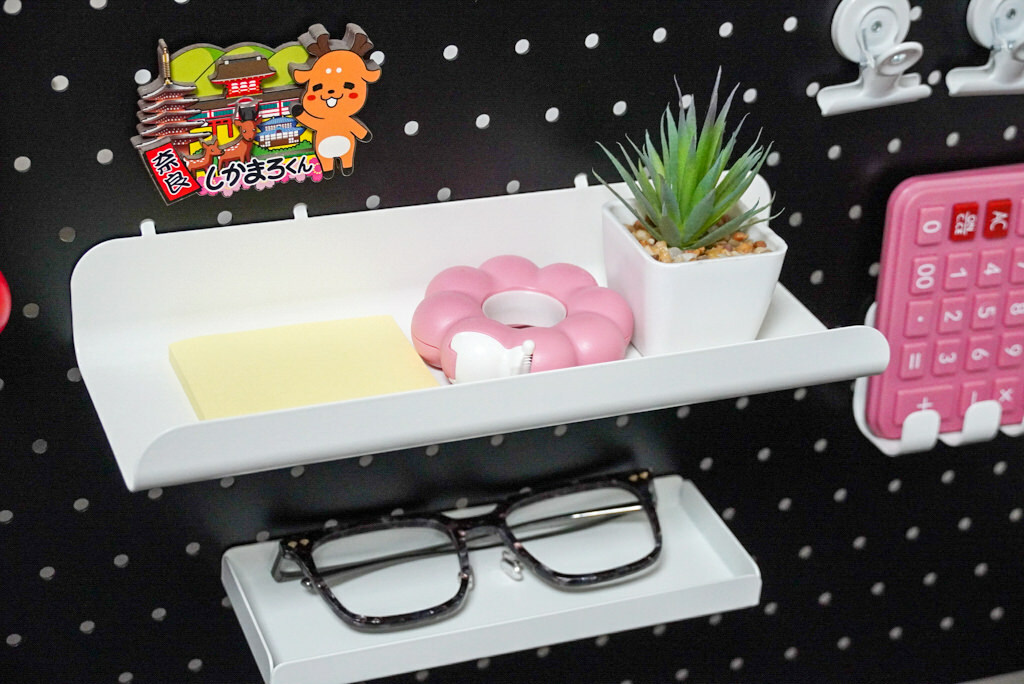 大洞洞板尺寸:74x37cm,全能收納組有掛式層架、掛式淺托盤、磁吸掛鉤層架、磁吸置物盒、磁吸夾子、掛鉤