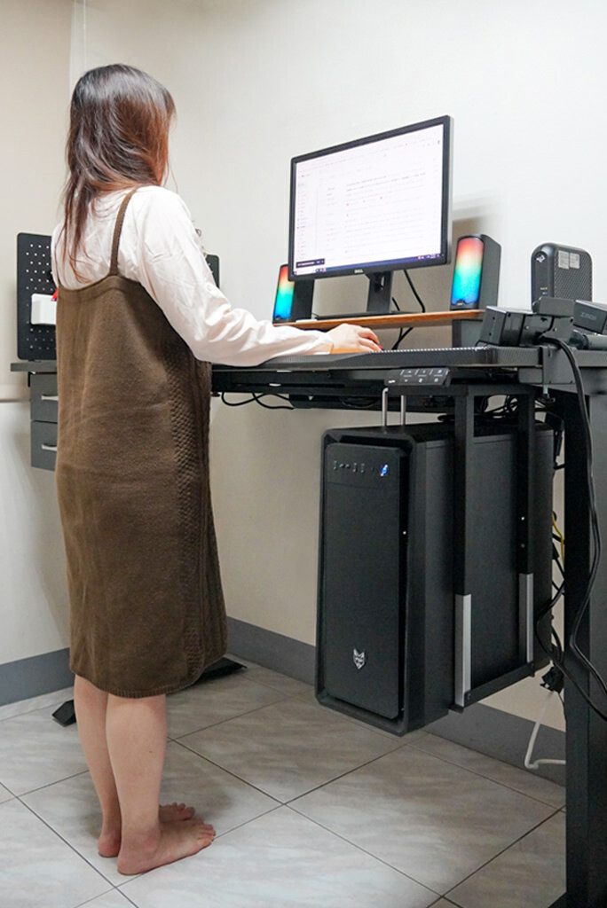 可以調整到100~110cm左右的高度,站著工作還可以扭腰動一動,更適合吃飽飯後追劇,不用坐著壓肚子不舒服,開始愛上站立的好習慣