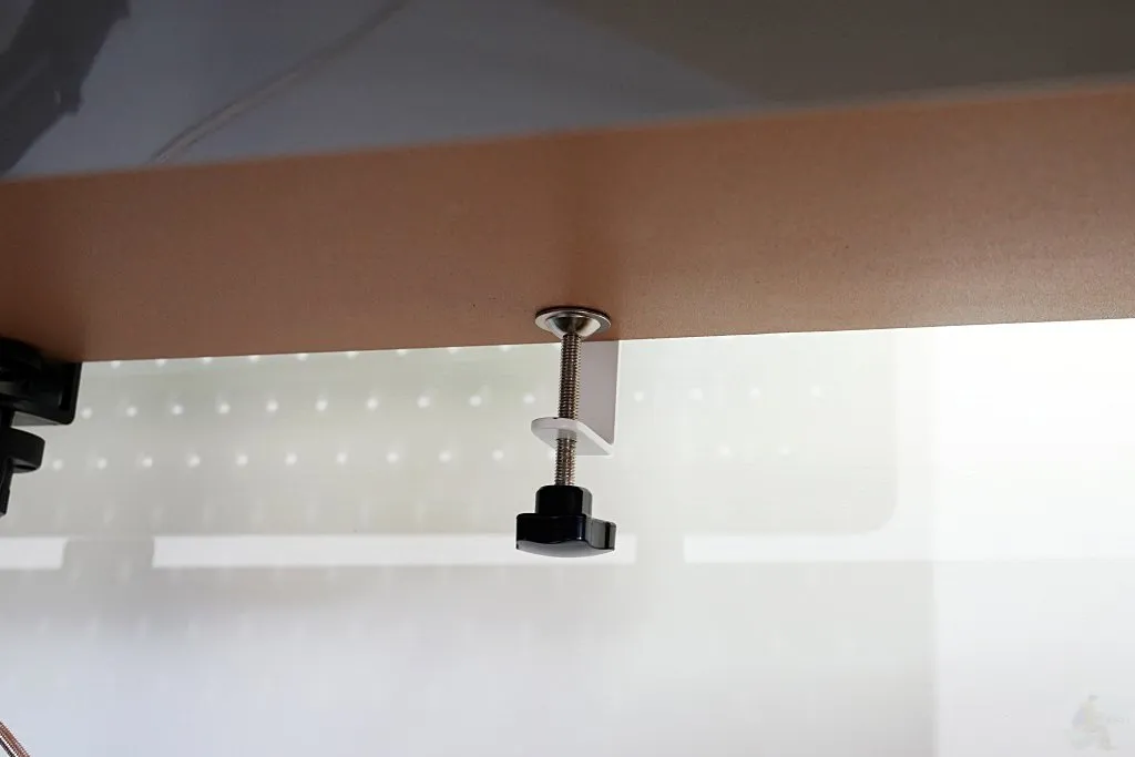 接著把桌面夾卡進去你要安裝的地方,再把螺桿鎖緊就可以囉!!