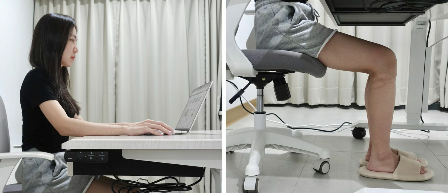雖然電動升降桌主打可以自由調整高度,但購買前一定要先確認適合自己的高度範圍,才能挑選到合適的桌子。如何從坐姿找到適合的高度?首先首先要先確保坐在椅子上的時候,屁股的高度不能低於膝蓋,且雙腳跟地面需呈現垂直 90 度。再來要確認坐在椅子上的時候,手臂能呈現 90 度平放在桌面上,同時坐姿不會有聳肩或駝背的狀態,如果是要看電腦工作的話,則要再留意眼睛注視螢幕的時候視線需要平行的,這樣的坐姿才會是最正確且不會讓身體出現緊繃痠痛的姿勢。