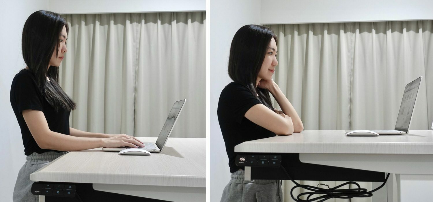 站著使用電腦的時候一樣也要留意手臂要能呈現 90 度平放在桌面,這個姿勢可以避免聳肩跟頸前引、也是最不會讓肩頸造成負擔的狀態。不論坐姿還是站姿都非常重要,才能跟電動升降桌一起相輔相成讓身體擺脫姿勢不良的痠痛感。一定要把坐姿跟站姿最適合自己身高的高度記下來再來選擇升降桌唷!