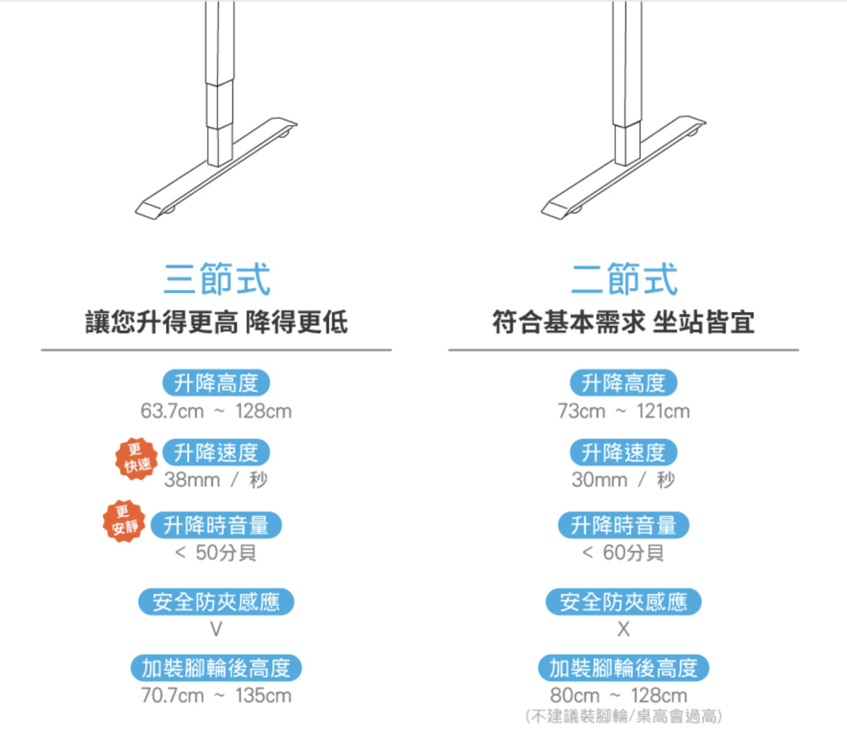 FUNTE 電動升降桌從可調整高度來看共有兩種款式「三節式&二節式」,由於我最後還會加上桌腳滑輪,且會有另一伴跟我一起共用桌子,所以希望在高度調整的選擇是更有彈性,最後選擇「三節式升降桌」。這兩款的升降桌在升降時的聲音都低於 50 分貝,升降過程也不會覺得聲音很干擾。