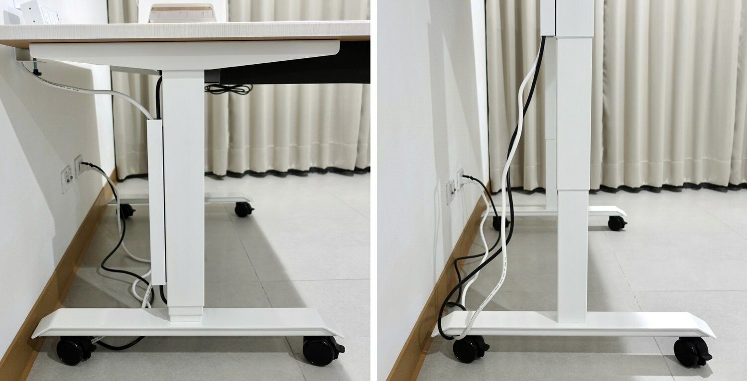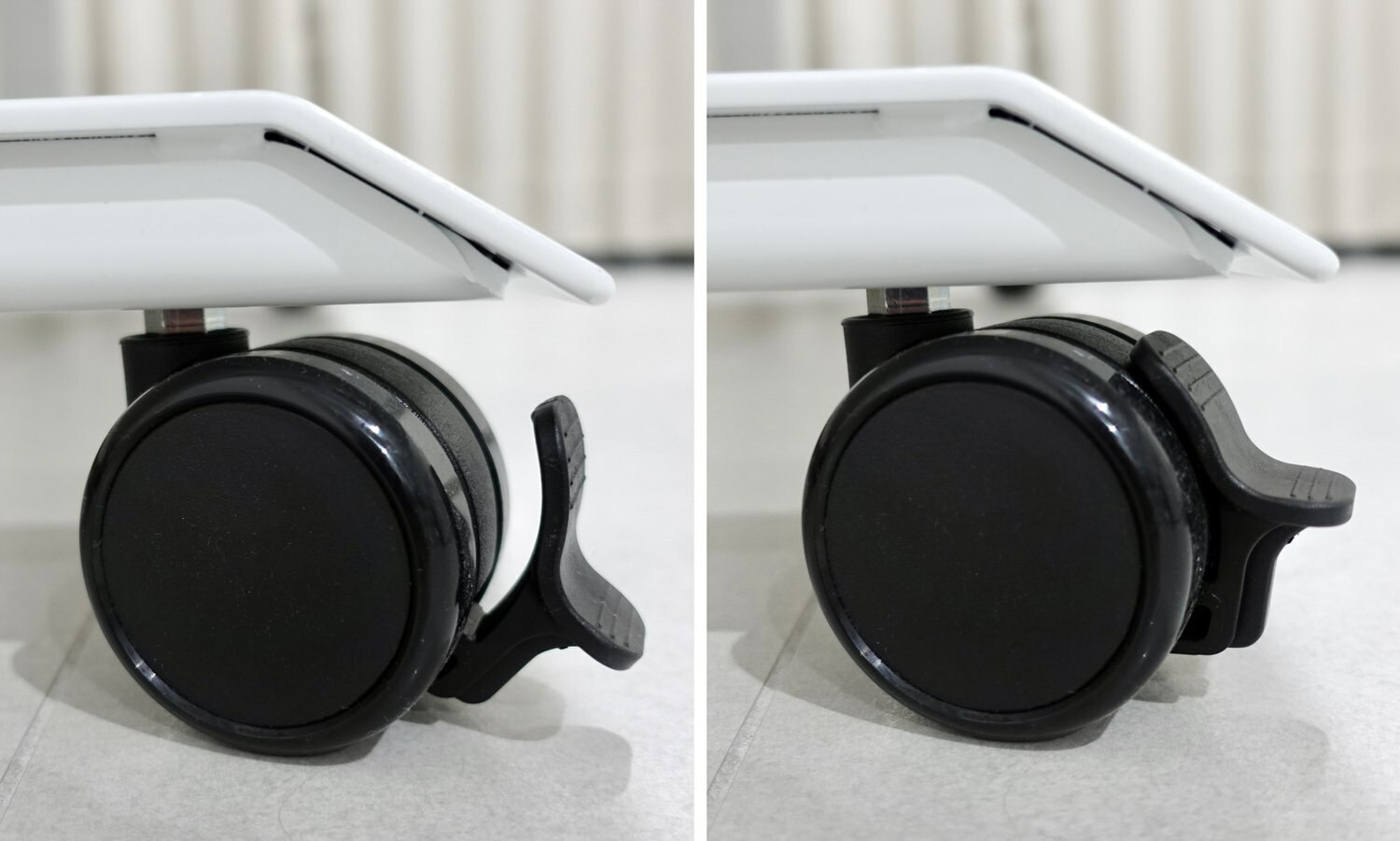 如果會有移動桌子需求的話建議一定要安裝「PU 腳輪」,畢竟升降桌都有一定重量,要能輕鬆移動桌子且不讓地板被刮傷,真的一定要安裝桌腳滑輪。PU 腳輪有煞車鎖扣設計,如果想固定桌腳直接按壓鎖扣就不會隨意滑動,非常方便。「PU腳輪」輪距高 5.5 公分,移動時更加穩固,不過建議選擇「三節式」電動升降桌的話再安裝滑輪,否則二節式升降桌加上滑輪後最低高度會是 80cm,仍高於一般正常桌子高度的 75cm,使用起來可能會不太舒適。