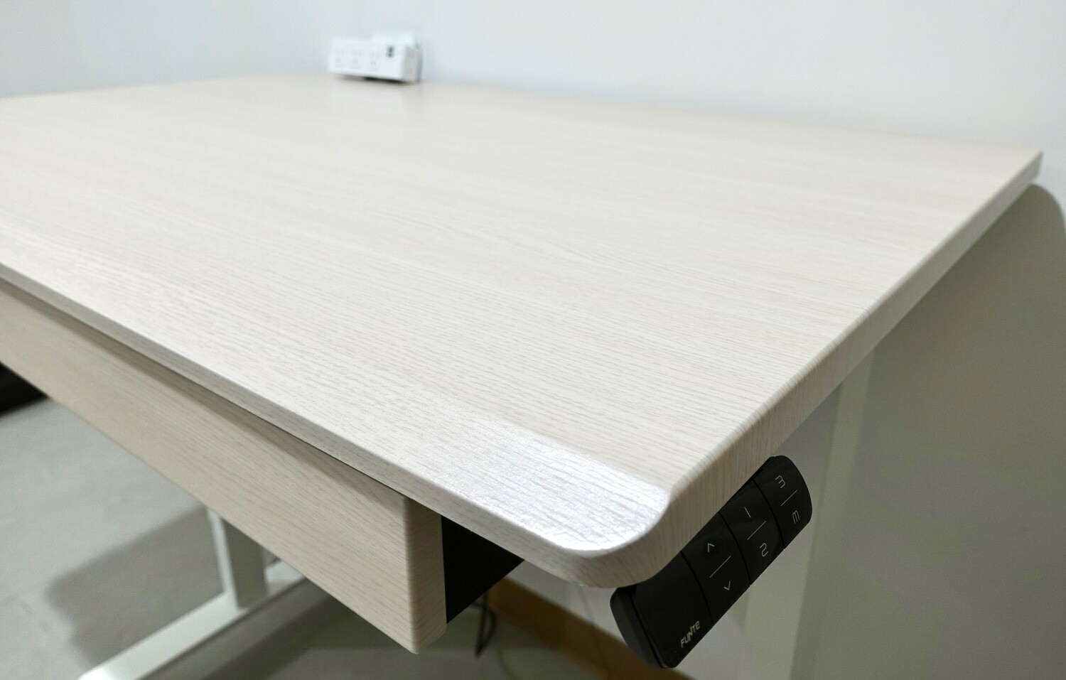 「FUNTE 智慧型電動三節式升降桌」桌板都是使用紐西蘭纖維板,屬於 CARB-P2 等級的纖維板,低甲醛含量可長時間安心使用,耐壓耐重、不易變形。此外,桌邊都有做圓角設計,平滑不刮手,靠近使用側的桌板還有做前緣上斜設計,不論是靠著用電腦打字還是讀書都很舒適。