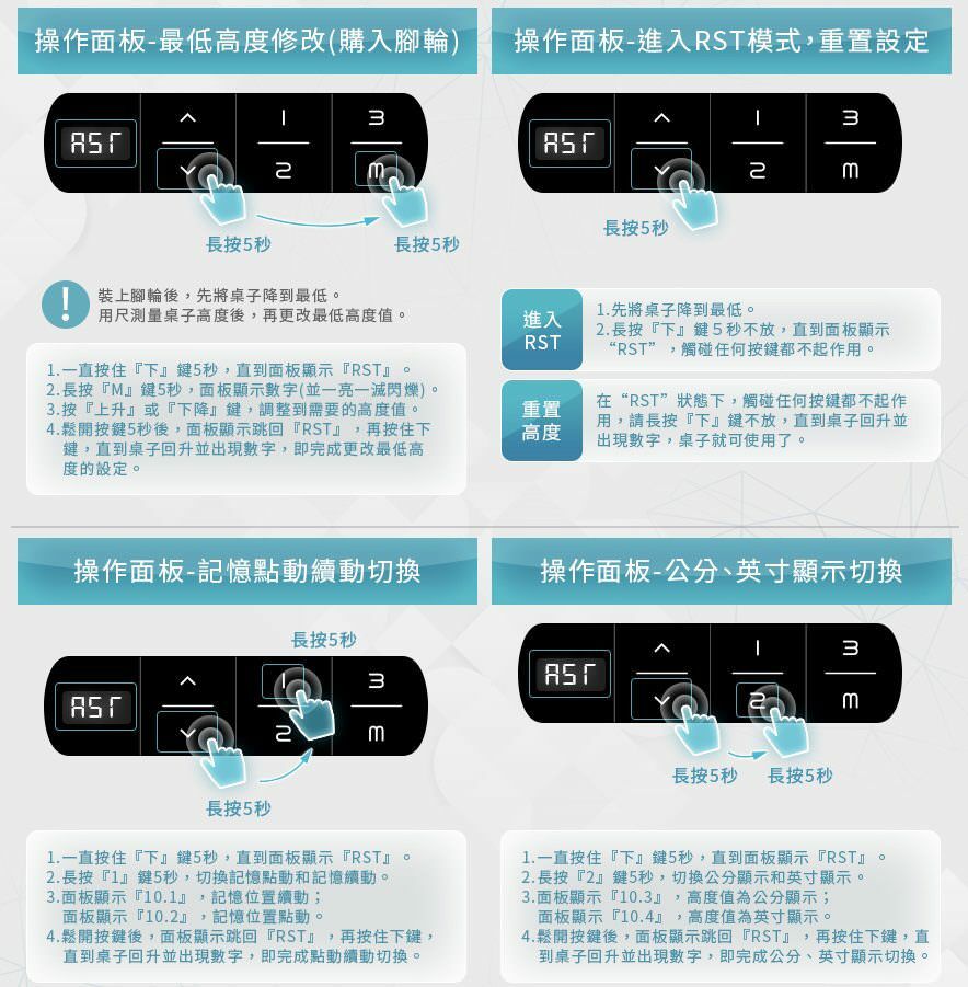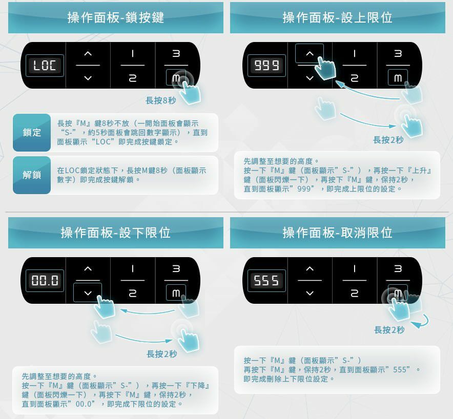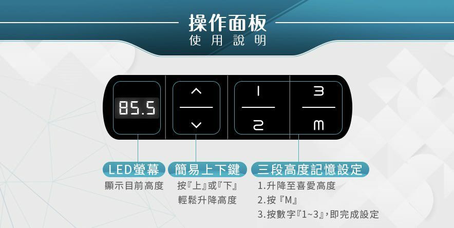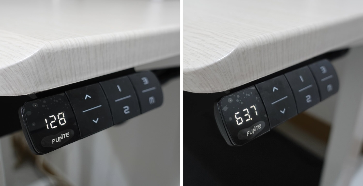 「FUNTE 智慧型電動三節式升降桌」操作面板非常淺顯易懂,主要分為 LED 螢幕會以數字顯示目前高度,上下鍵直接輕鬆調整升降高度,還有三段高度記憶設定,最高可升至 128 公分、最低則為 63.7 公分。能自行將常用高度設定成預設模式,在不同需求高度的切換上變得更快速且方便!