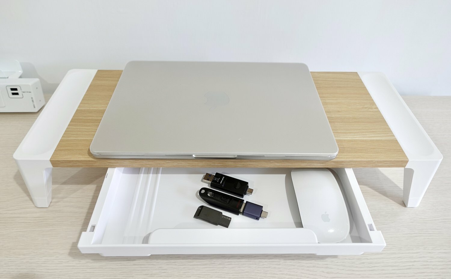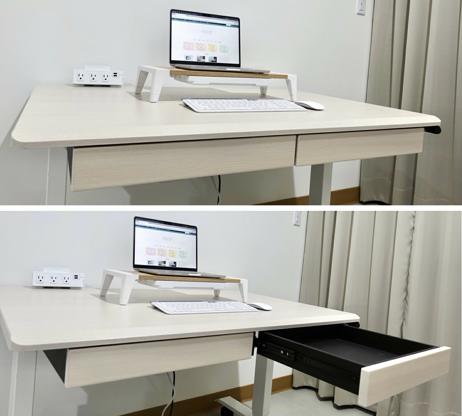 「桌下型單層抽屜」是我使用下來認為覺得相當實用的配件之一,因為升降桌本身完全沒有任何抽屜及收納空間,桌下型收納抽屜可以讓桌面維持乾淨整潔,像是記事本、充電器、資料夾文件等,平時可能使用率不高的物品都收納起來。「桌下型單層抽屜」為台灣製的三段式滑軌,滑軌的質感非常好,在推拉的時候可以感覺到真的是非常穩固的滑動感,抽屜顏色選擇可以跟桌面搭配同款色系或是撞色系搭配都可以。