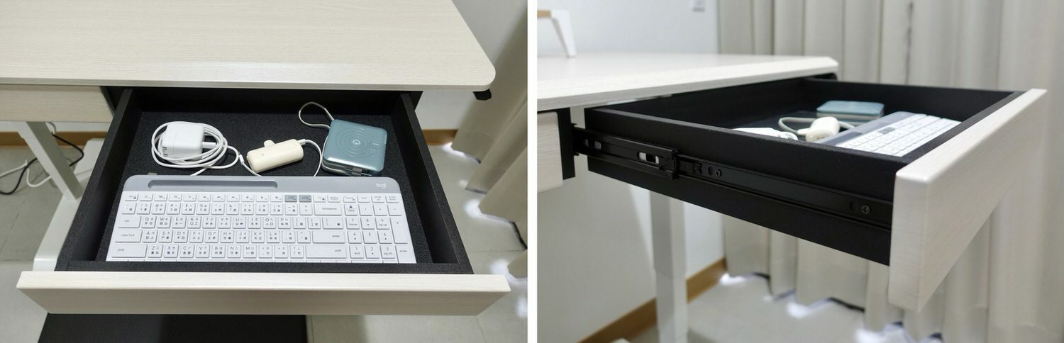 不過選擇「桌下型單層抽屜」要特別注意的是一定要搭配超過 70cm 桌板深度才能安裝,如果 120 公分寬度想安裝兩個抽屜,升降操作面板則會需要安裝在桌子側邊,所以在安裝前也要評估進去唷!