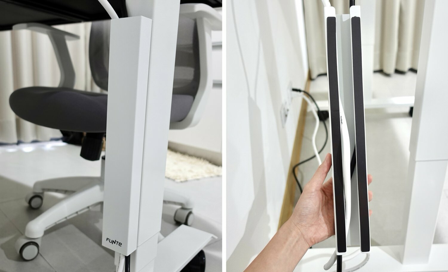 「磁吸式走線槽」完全是電線收納救星,畢竟升降桌一定會需要插電,加上電子產品的充電線,透過走線槽把電線收納隱藏起來,桌下的線路就會變得很凌亂又容易纏繞在一起,搭配磁吸設計,不需要再額外打孔且能隨時調整位置,非常實用。FUNTE 很貼心低在「磁吸式走線槽」設計了三款顏色「白、黑、灰」,分別可以跟桌腳的顏色選擇相同,就不話擔心走線槽跟桌腳顏色不同就會看起來突兀。