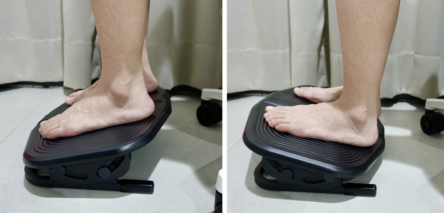 「人體工學可傾斜腳踏板」是防滑按摩材質,踩踏在上面也非常紓壓且防滑,同時腳踏板還有 ±20° 的角度範圍可以彈性調整,搭配習慣的坐姿找到最適合且舒服擺放雙腳的方式~
