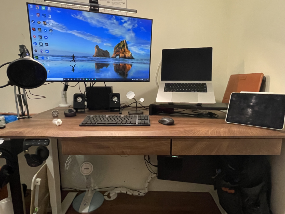 由於我有很多架高3C,包括1個超貴的 Dell 螢幕搭配螢幕支架、1個遊戲用Acer螢幕、還有1個麥克風支架,另外也吊掛耳機、背包,因此我非常需要一個能穩定升降的升降桌。