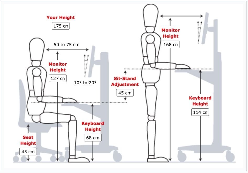 我於是 Google 找到一個網站:ergotron.com/tools/workspace-planner,只要輸入個人身高,就能立刻找到自己的的最適坐姿、站姿高度,如下圖(我身高175cm)