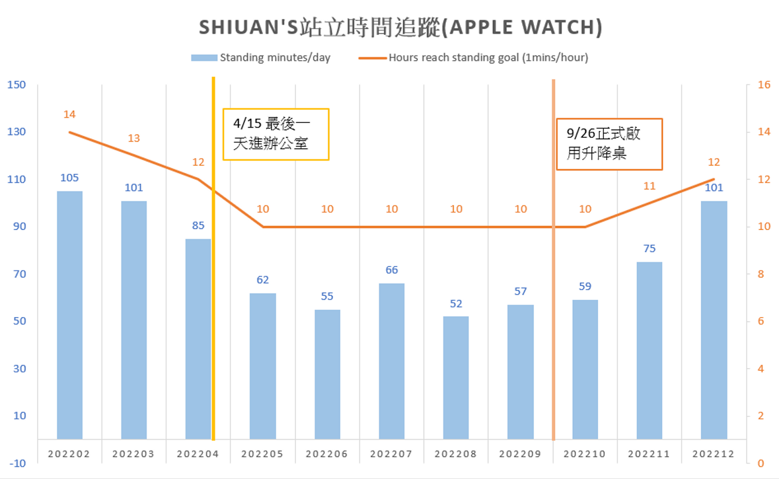 2022/02-2022/04是辦公通勤時期,2022/05-2022/09則是「使用升降桌前」居家辦公期,2022/10以後則是「使用升降桌後」居家辦公期