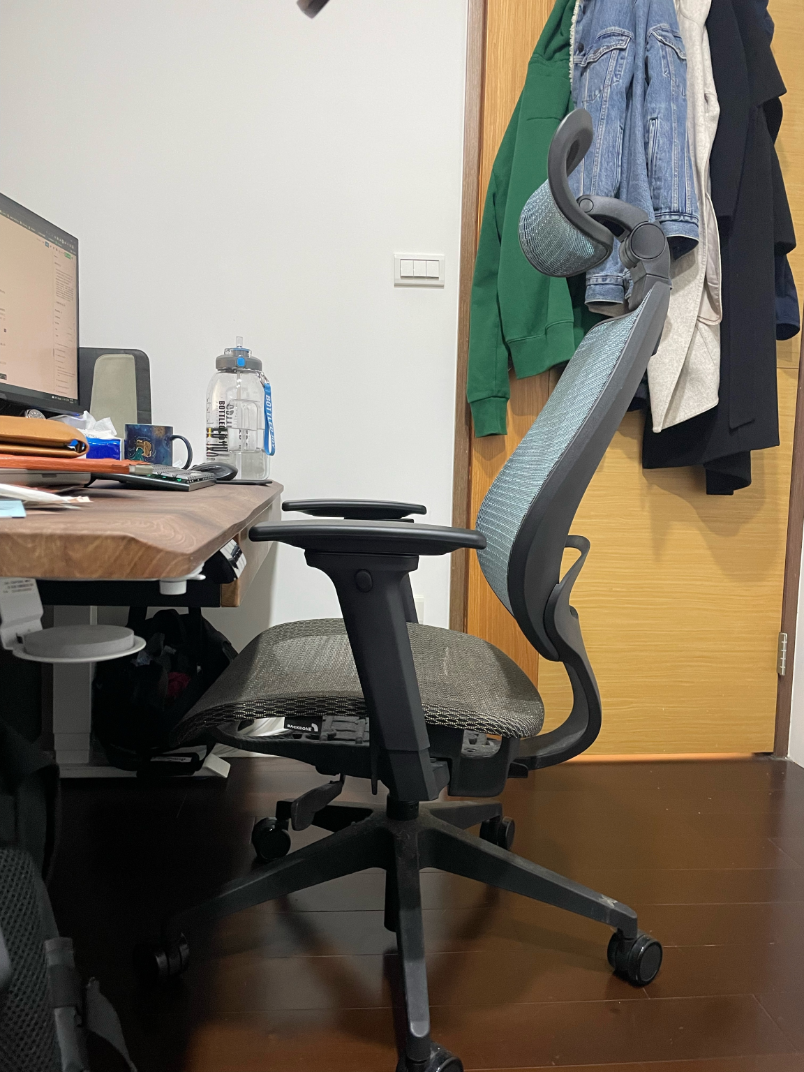 大部分的人工學椅買來之後就沒有調過高度(因為桌高不會變),但有了升降桌之後,你可以更彈性的調整自己的不同姿勢下的椅高,像是我會在坐姿模式時把工學椅調得更低(離地45cm)、趴姿模式時把工學椅調高(避免趴下時大腿壓迫)。