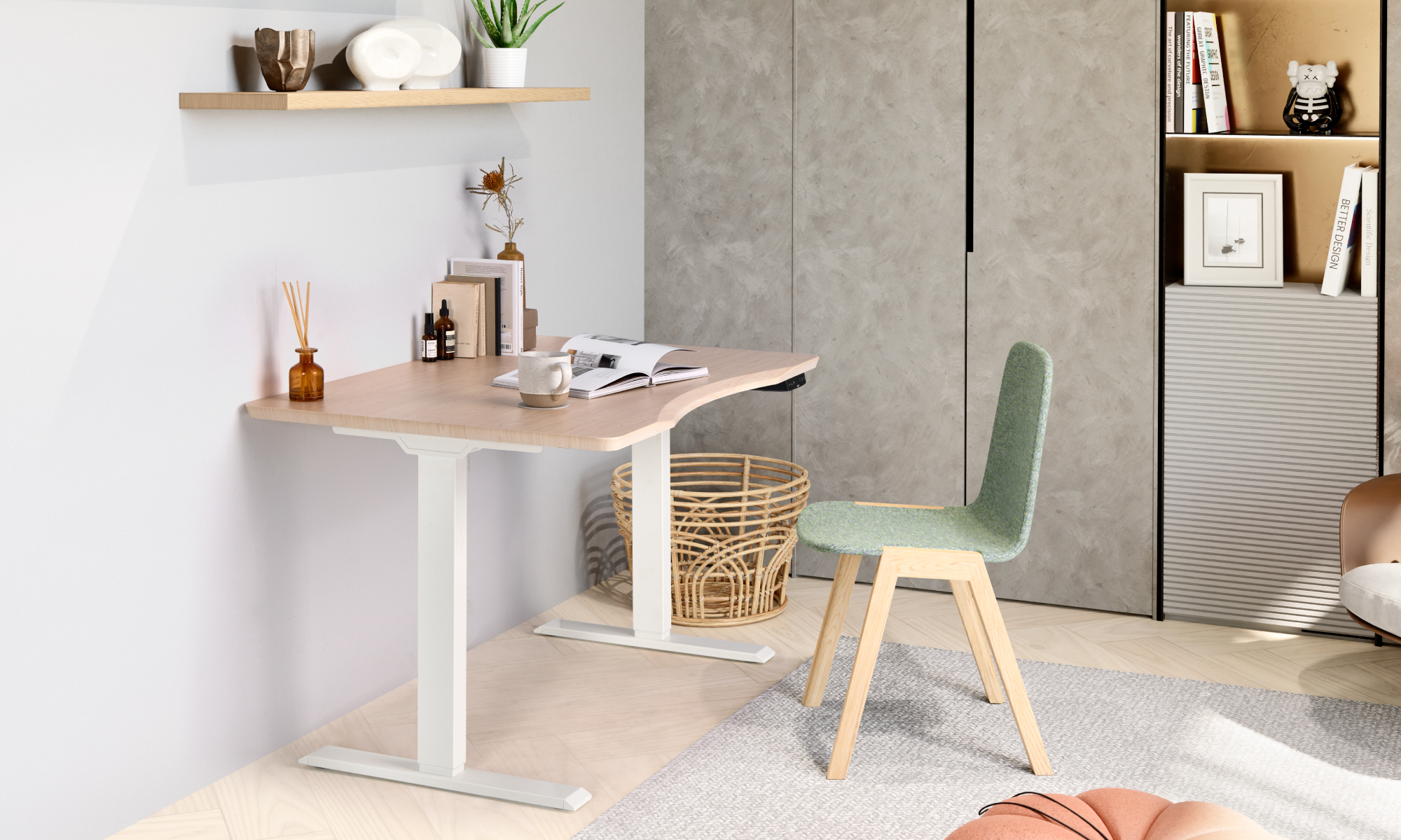 當桌子高度太高,手平放桌面時反而會「聳肩」,平時上班 8 小時都在聳肩、肌肉出力的狀態下,會痠痛不是沒有原因的!正確的姿勢是要在坐著時,手臂能呈 90 度平放桌面,桌面和手肘同樣高度,讓肩頸與背部肌肉放鬆。說到這,你是不是發現自己平常使用的桌子也太高了呢?