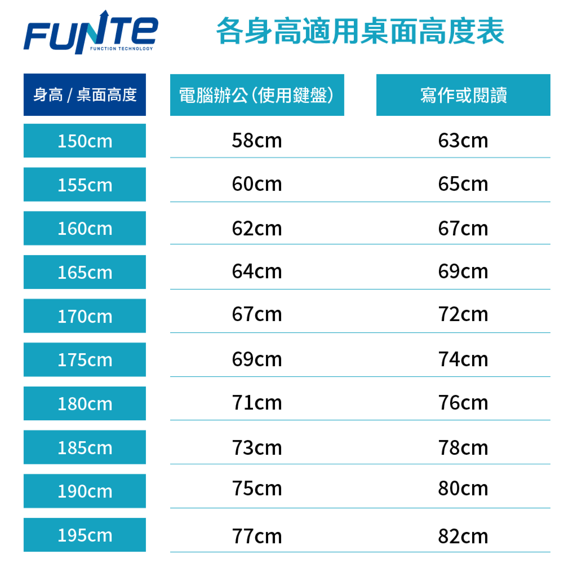 網路上有許多根據身高來計算桌面高度的公式,以下直接為你統整各身高依序對應的桌面高度,且在不同使用情境下,高度也會有所差異。
