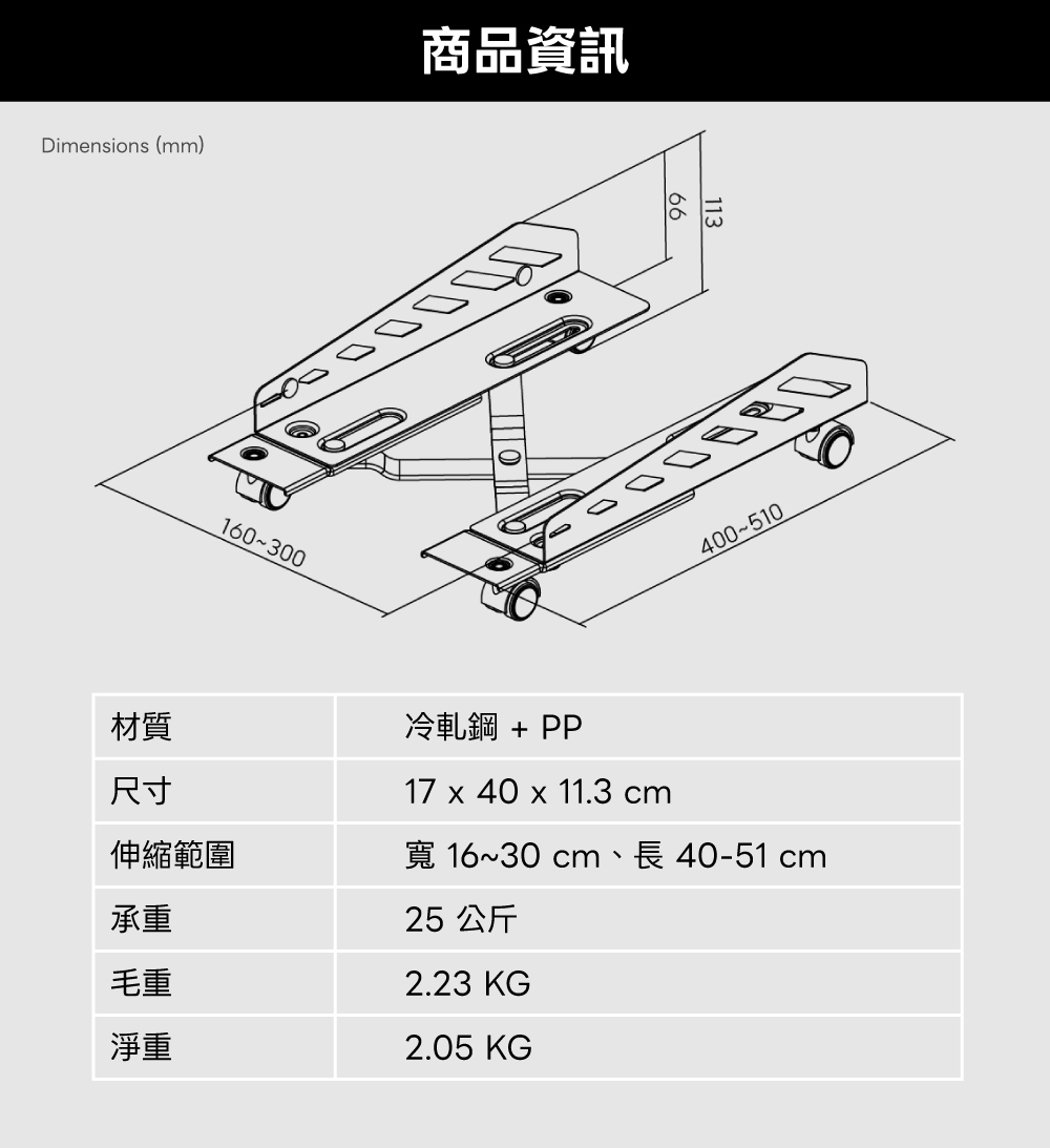 ✅ 寬度可伸縮 16~30 cm / 長度可調節 40~51 cm