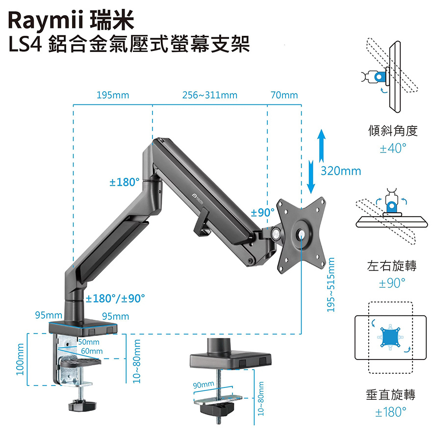 【瑞米 Raymii LS4 鋁合金 氣壓式螢幕支架】