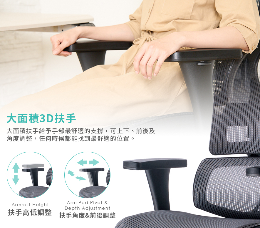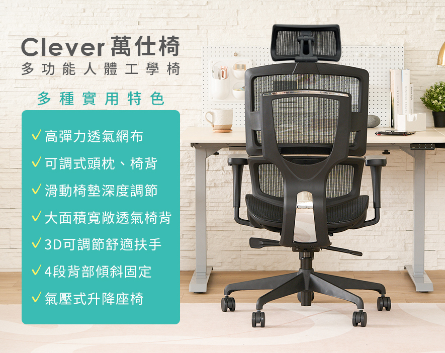 Clever 萬仕椅,高 CP 值的多功能人體工學椅✅ 高彈力透氣網布椅背,夏日久坐不悶熱✅ 氣壓式升降坐椅,隨身高自由調整超順手✅ 頭枕角度 / 背部傾斜 / 椅墊深度皆可調節✅ 獨立腰靠+3D大面積扶手,就是要你坐得舒適✅ 承重136公斤台灣設計製造,兩年保固,終身保修