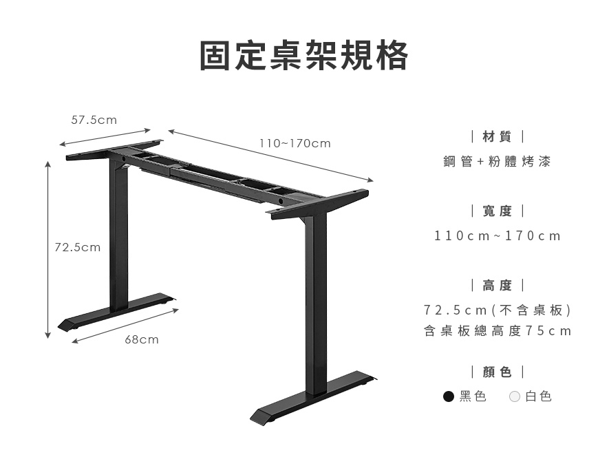 ※ 固定桌腳高度為 75cm,欲裝腳輪請留意裝上後,最低高度為 82cm。