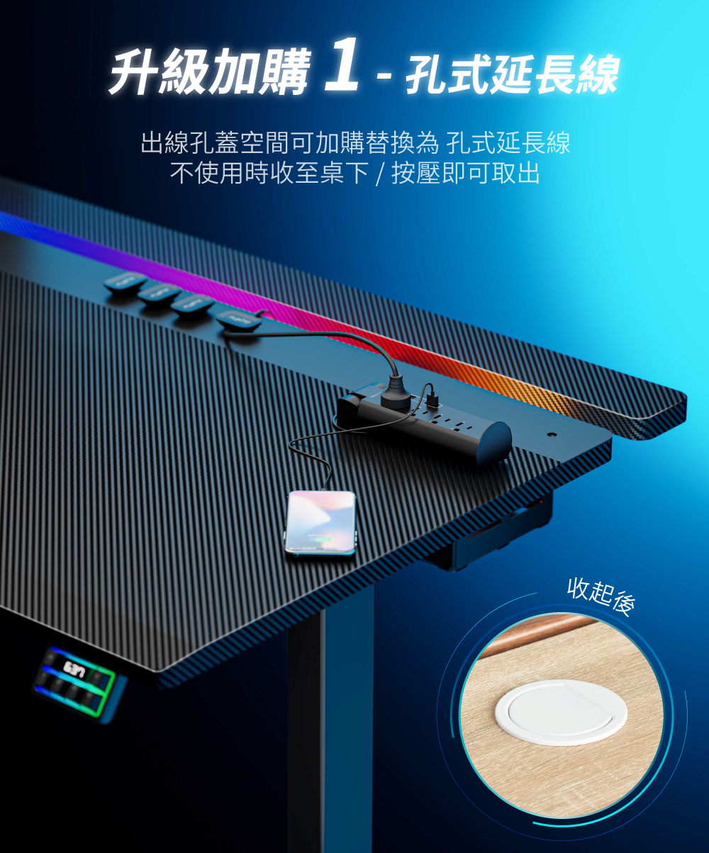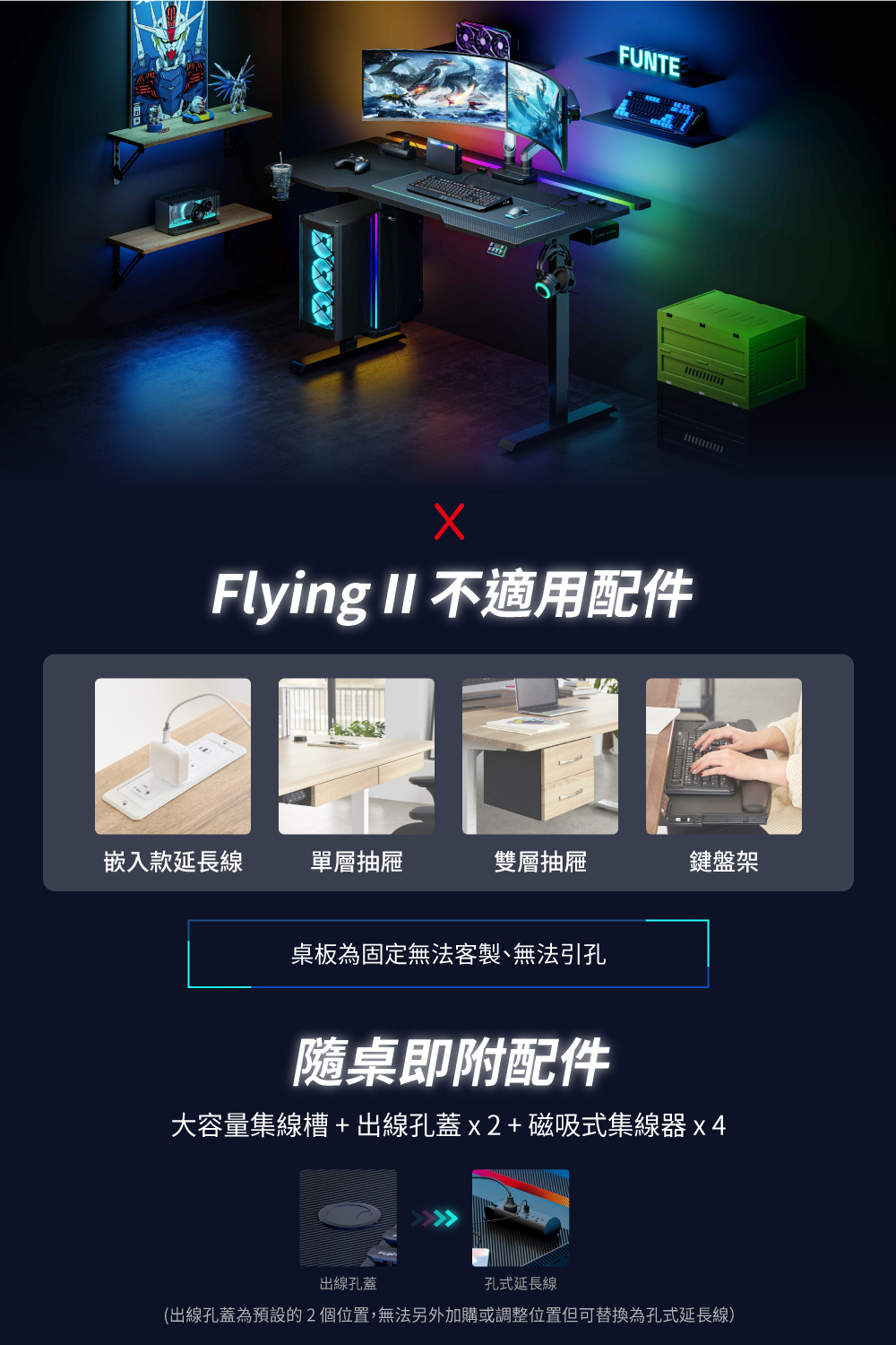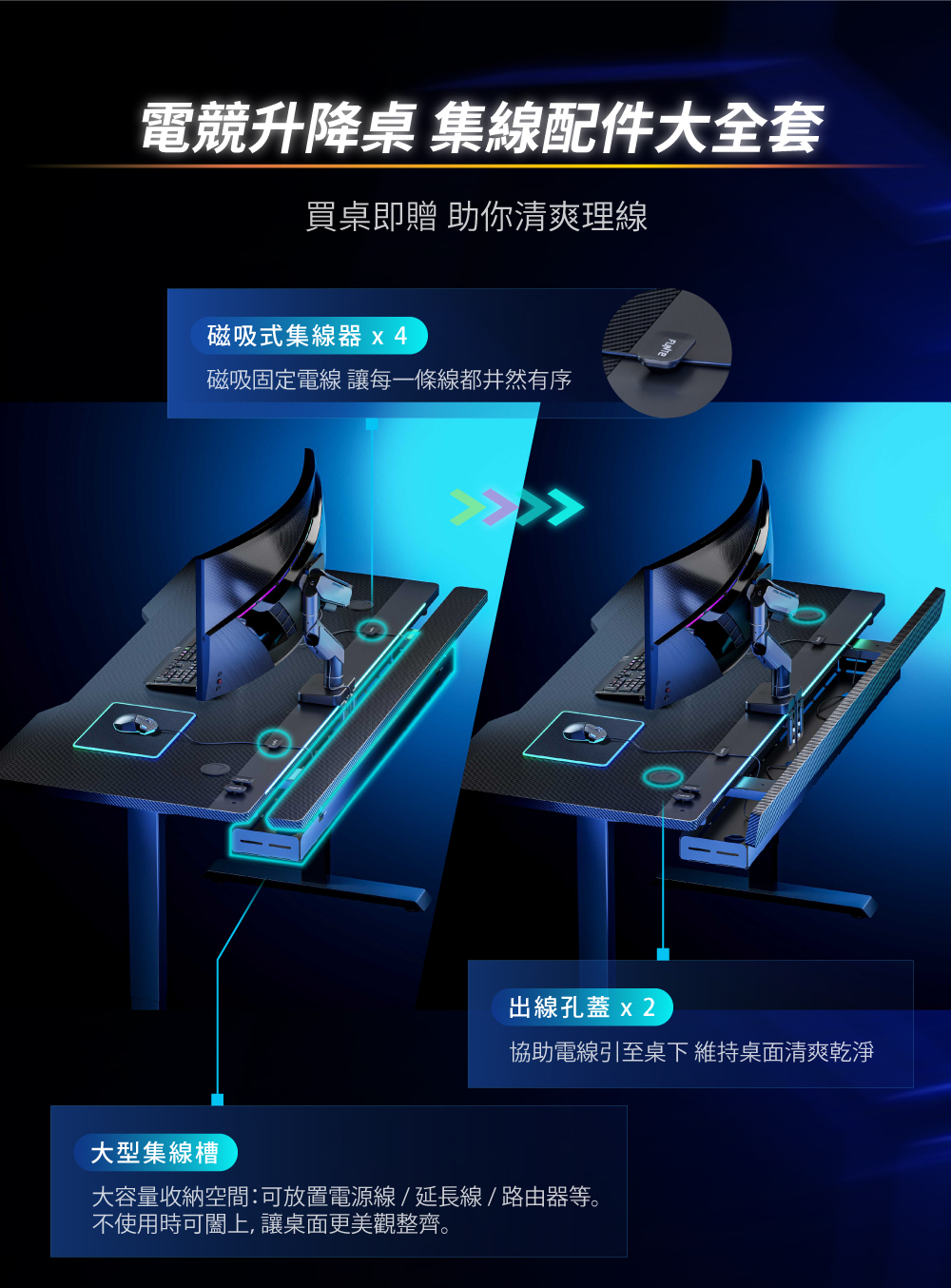 ✅ 買桌即附集線配件大全套:大型集線槽、出線孔蓋x2、磁吸式集線器x4