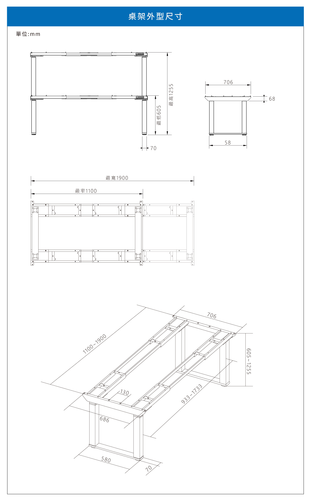 ✅ 升降範圍:60.5~125.5 cm(不含桌板)