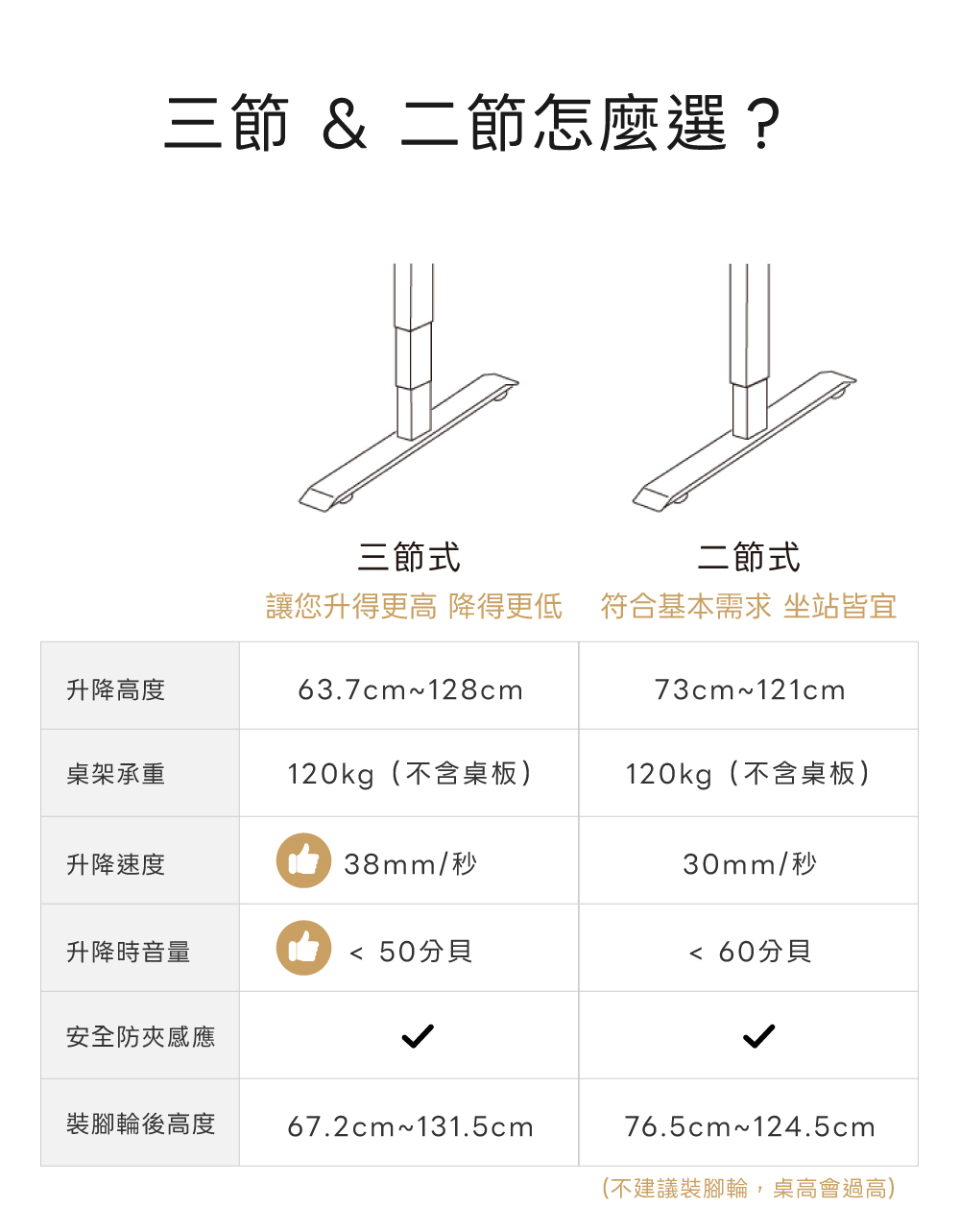 ✅ 三節式升降高度 63.7-128cm,升降速度 38mm/s