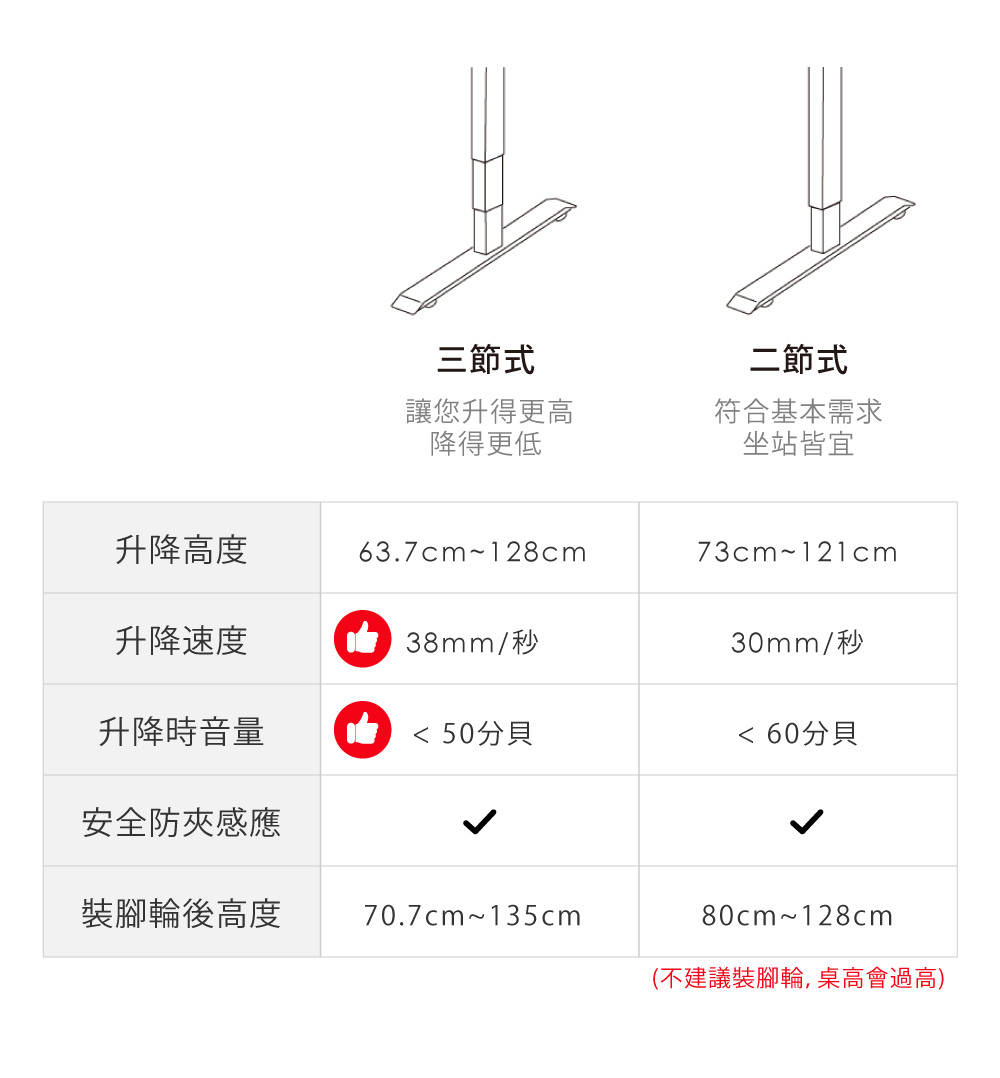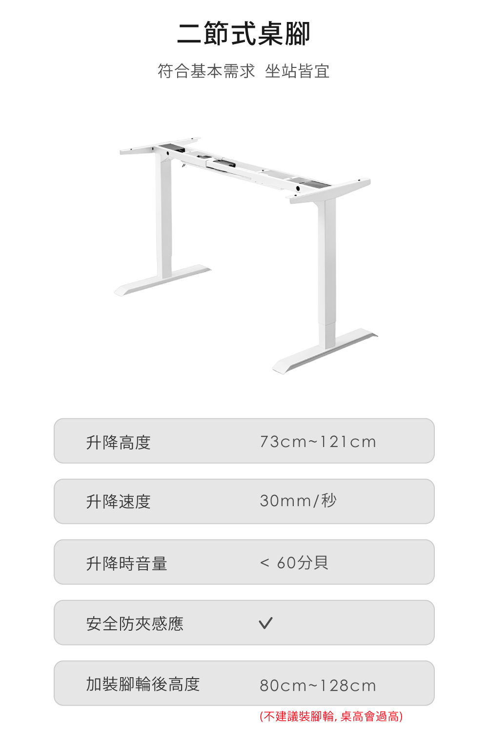 ✅ 二節式升降高度 73-121cm,升降速度 30mm/s