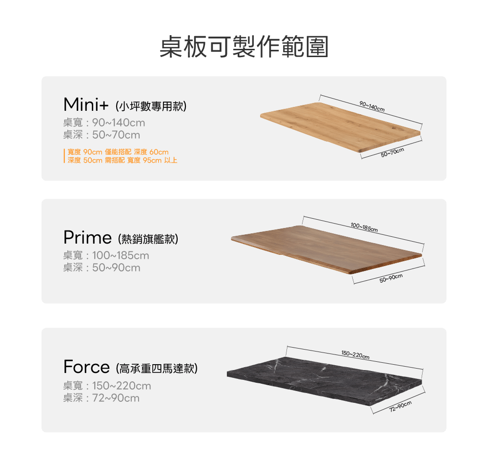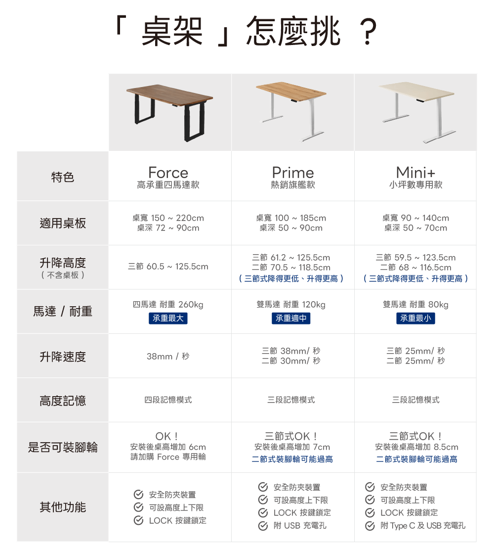 ▸ 桌架款式:Prime 三節、Prime 二節、Mini+ 三節、Mini+ 二節、Force、Stable 固定桌