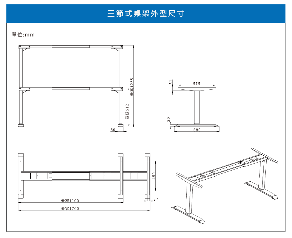 ✅ 三節升降高度:65.2~129.5cm