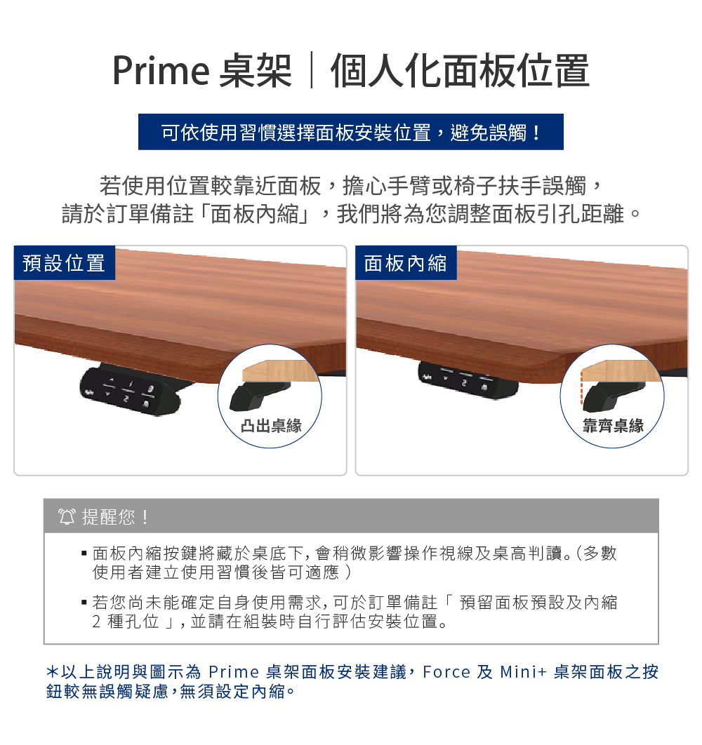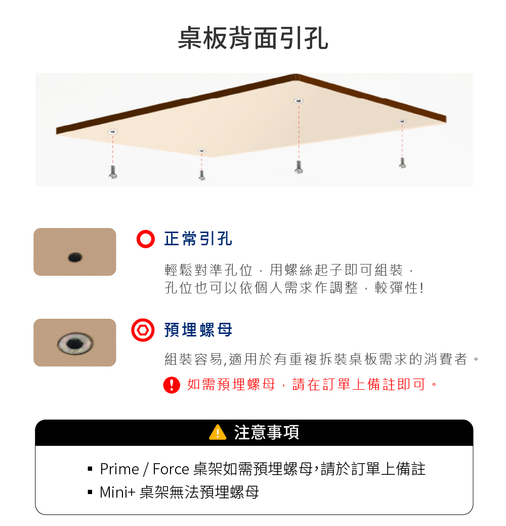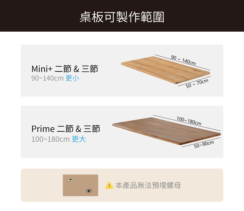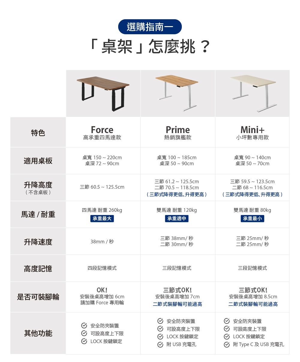 ▸ 桌架款式:Prime 三節、Prime 二節、Mini+ 三節、Mini+ 二節、Force、Stable 固定桌
